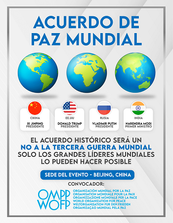 La Organización Mundial por la Paz OMPP WOFP, quiere poner de manifiesto su felicitación por la firma del histórico acuerdo que han logrado los Señores Jefes de Estado de los gobiernos de Estados Unidos de Norte América, HE Presidente Sr. Barack Obama y de la Federación de Rusia, HE Presidente Sr. Dimitry Medvedev, quienes decidieron reducir ojivas y vectores nucleares. Esta acertada decisión que las dos potencias mundiales han pactado en común acuerdo en la Cumbre de Moscú realizada el 6 de Julio de 2009, de reducir un tercio de las cabezas nucleares entre ambas potencias, dando inicio a la reducción mundial de armas, que consideramos, es el comienzo de un importante y nuevo capítulo que brindará seguridad al mundo, donde el resto de países equipados con armamentos nucleares deberán imitarlos, adhiriéndose a este programa de desarme. ver más
